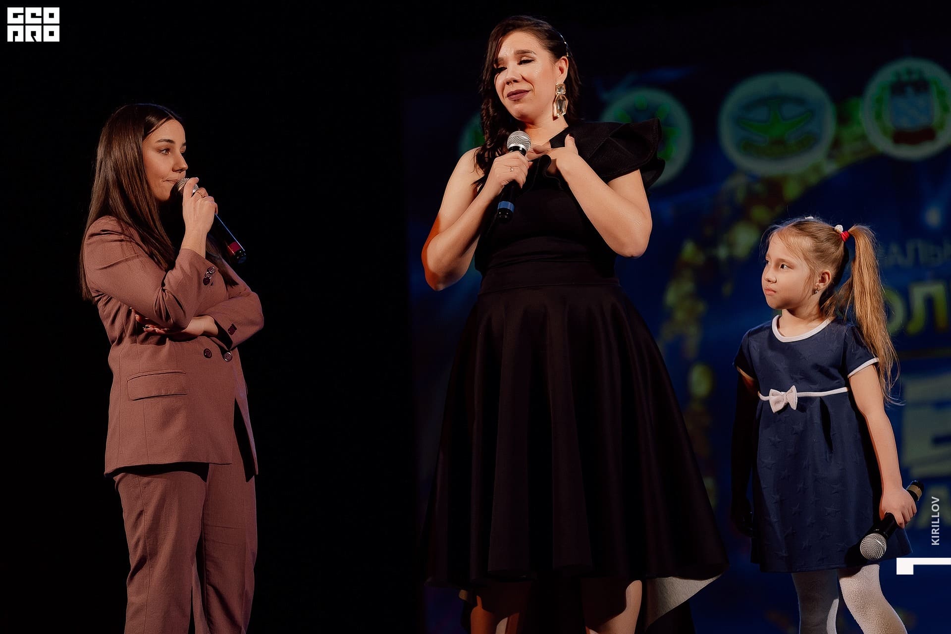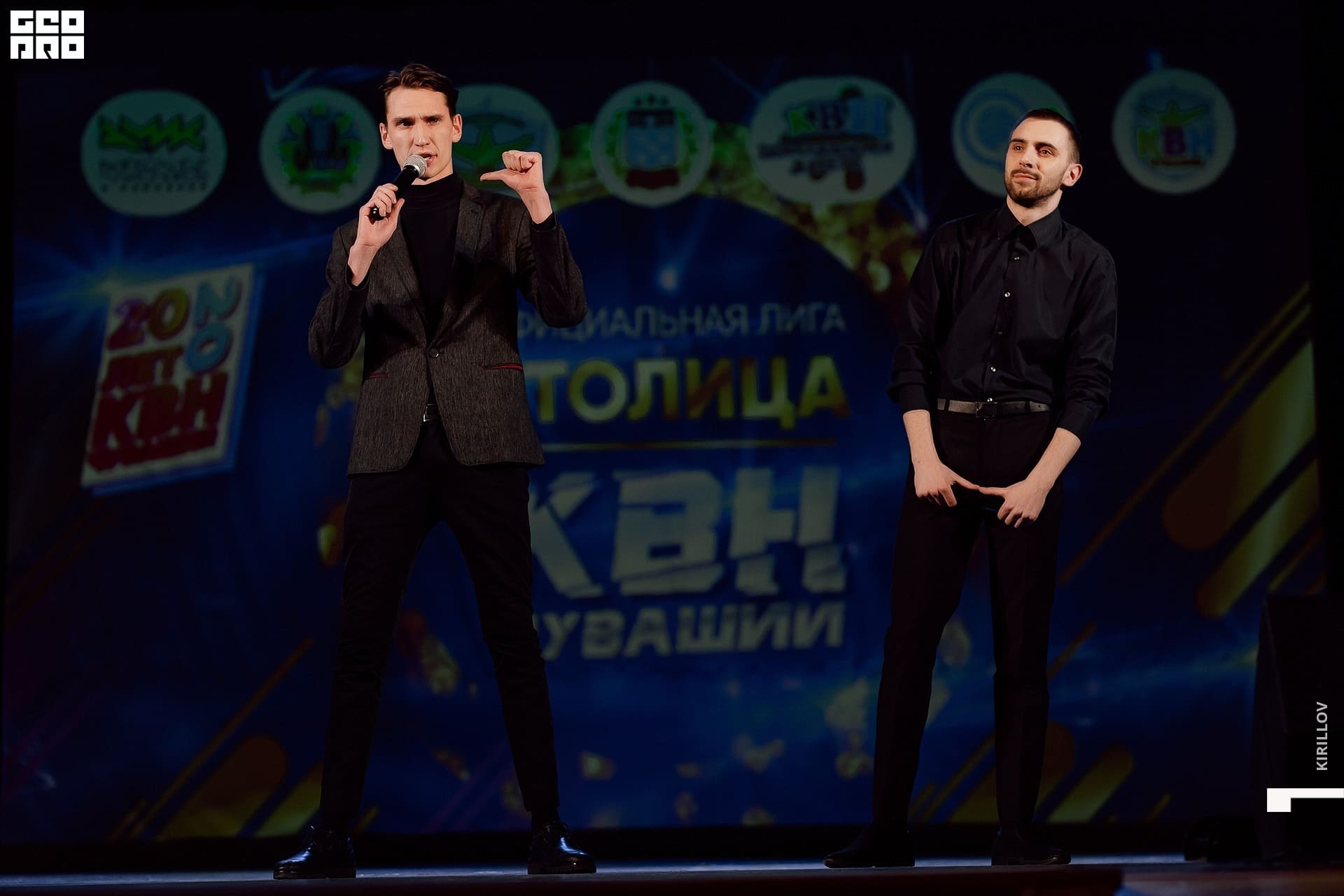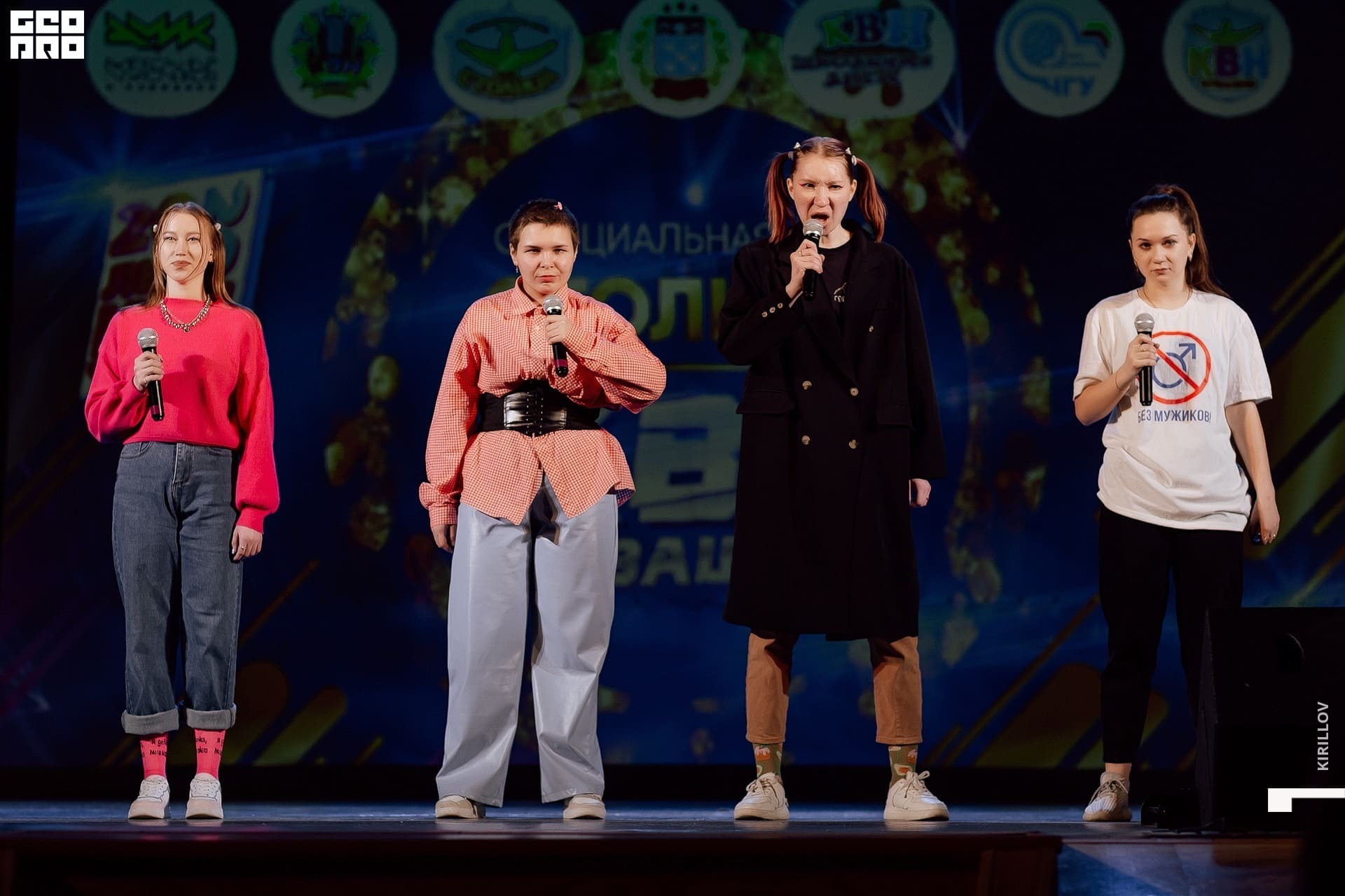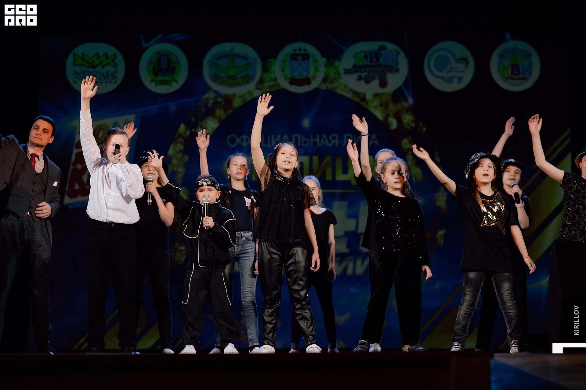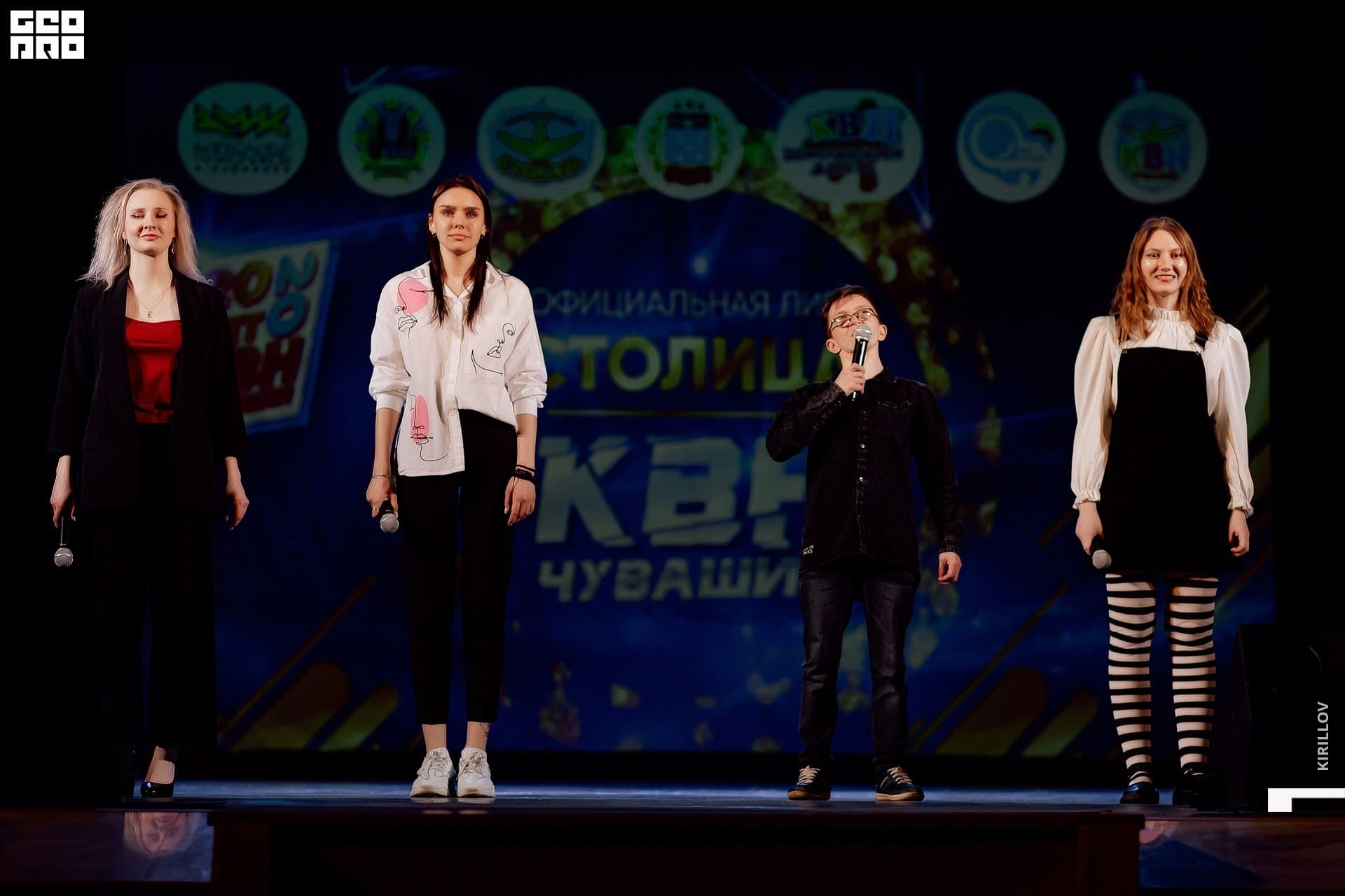 На сцене ведущая Маша Егорова и поющая Саша Голубева. Обеих знаем по многим командам КВН. Прекрасный дуэт смешных карапуль. Схема простая, а главное - рабочая: Маша объявляет, Саша поёт. Ну и весёлые диалоги. Финалочка - номер с участием ещё и «орущей» - Сони - дочки Саши, которая поёт не хуже и не менее смешно! Удачи, девчонки, чтоб хватило на весь сезон. Снова положили зал на лопатки. Заслуженная победа в игре. Поздравляем!