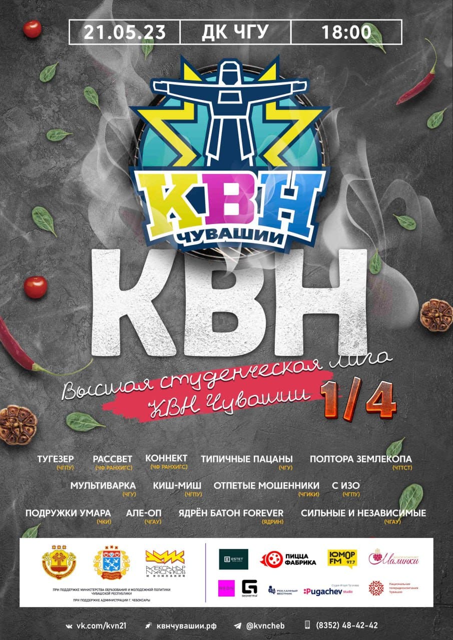 Школьным командам ещё раз огромное спасибо за классный сезон и шикарный финал! А мы приглашаем всех зрителей на завершающую весеннюю игру - 1/4 финала Высшей студенческой лиги КВН Чувашии, уже в это воскресенье, 21го мая, ДК ЧГУ, 18:00!