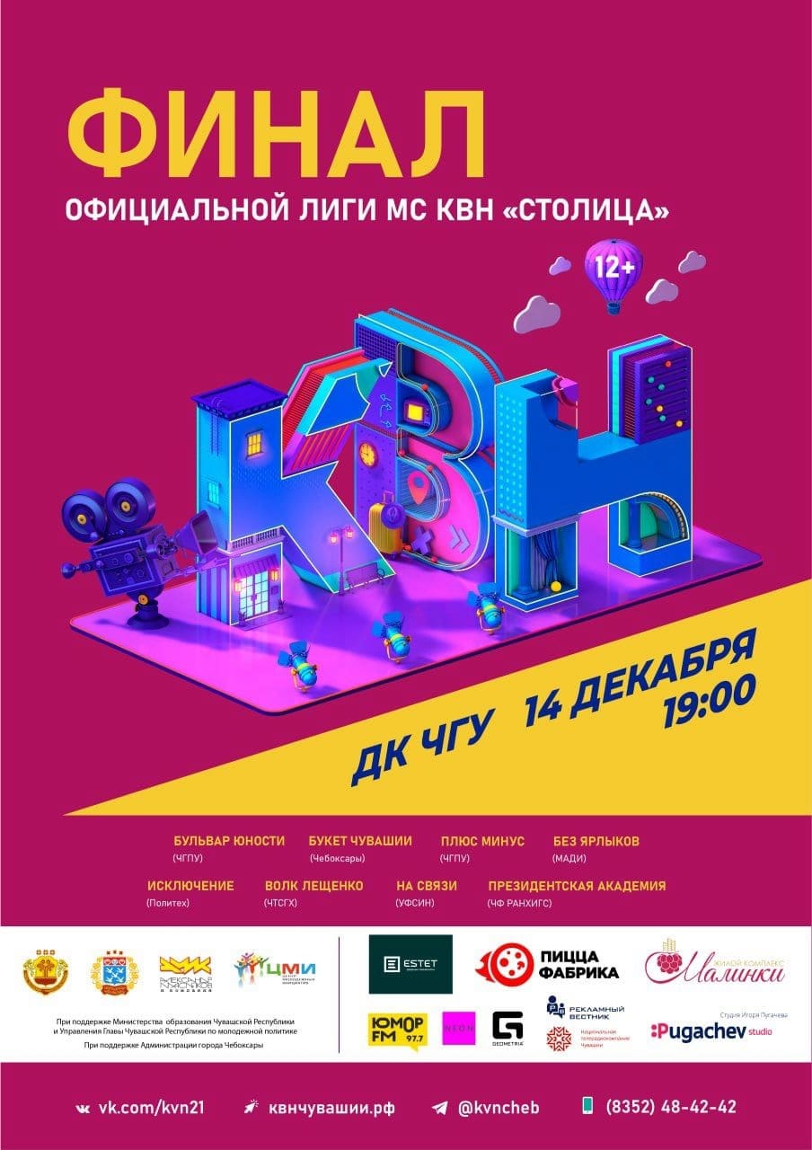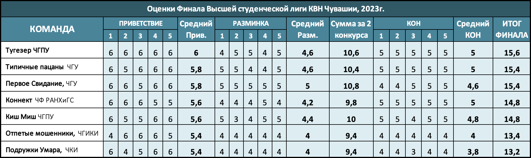 Завершился сезон Высшей студенческой лиги КВН Чувашии! Финал состоялся, новый чемпион вписан в историю, переходящий кубок с более, чем 20-летней историей, отправился в ЧГПУ! Поздравляем команду КВН "ТУГЕЗЕР"!!! И, конечно же, всех призёров, которых в этом замечательном финале получилось очень много, что не может не радовать! Но обо всём расскажем по порядку. В жюри финала: Михаил Елисеев, Анна Николаева, Дмитрий Айдаров, Александр Яковлев, Алексей Леснов. Ведущий игры - Роман Сергеев. Команды сыграли три финальных конкурса: Приветствие, Разминку и КОН (конкурс одного номера). Борьба шла до последнего, перед финальным конкурсом лидировала одна команда, а потом... ниже все подробности: