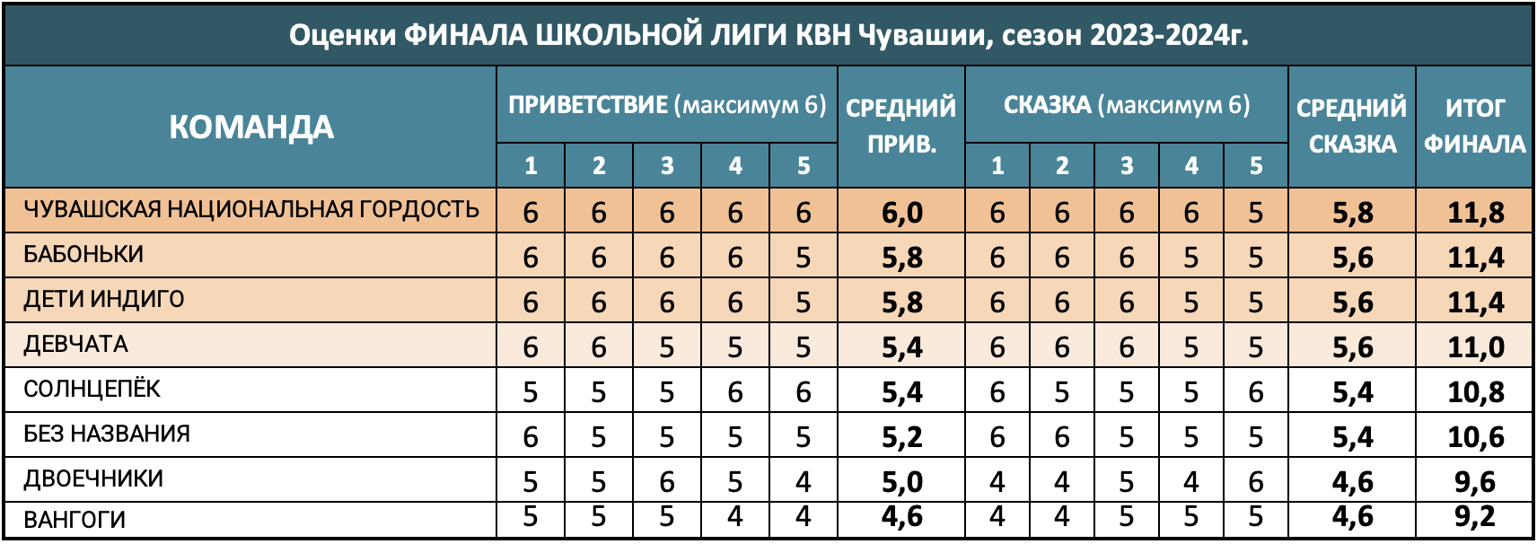 Восемь команд. Два конкурса. Два часа юмора. Более пятидесяти талантливых детей на сцене ДК ЧГУ. И классная поддержка в зале. Всё это - финал сезона, который состоялся 4 мая. В жюри финала: Анна Николаева, Максим Соколов, Алексей Тарасов, Юлия Чернова, Игорь Пугачёв. Сыграли "Приветствие" и "Сказку". Количество команд для финала в этом сезоне получилось больше обычного, но игра от этого только выиграла! Помимо кубков за призовые места, вручались кубки лучшему актёру, лучшей актрисе и за лучшую шутку игры. Также был специальный приз зрительских симпатий от Вконтакте - умная капсула "Маруся" по итогам онлайн-голосования в группе КВН Чувашии Вконтакте прямо во время игры. Подробнее о выступлении каждой команды и резальтаты финала и сезона: