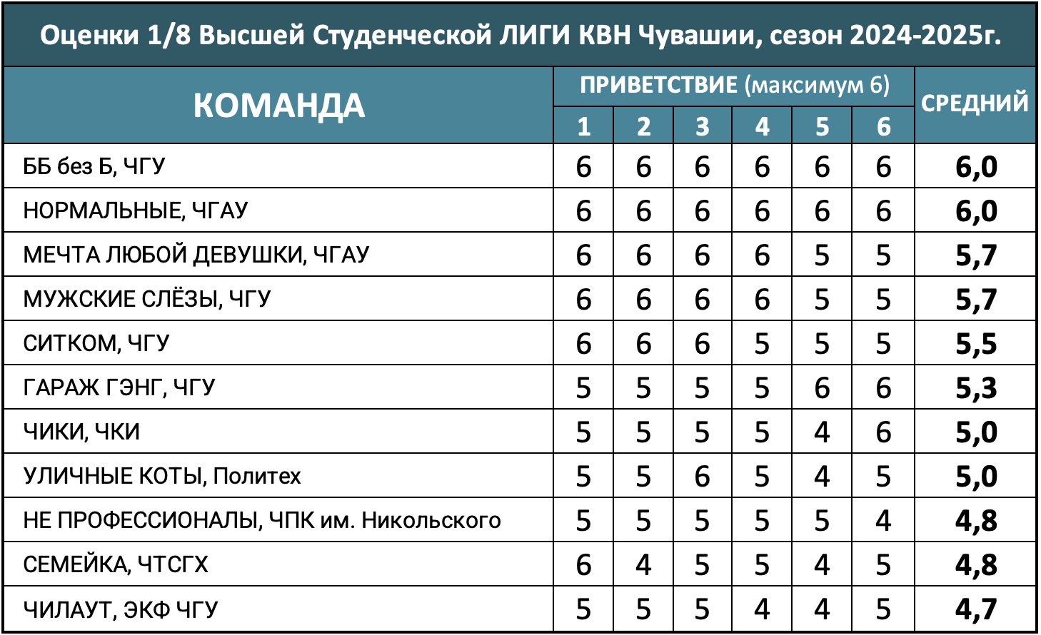 5го мая состоялась первая игра сезона Высшей студенческой лиги КВН Чувашии - 1/8 финала. В сезоне стартанули 11 команд из ВУЗов и ССУЗов города. Молодые, амбициозные, смешные и талантливые команды, большинство из которых впервые вышли на КВНовскую сцену! Традиционно в нашей Высшей студ лиге, всем командам даётся шанс сыграть минимум две игры, а это значит - никто не вылетает и по сумме баллов за 1/8 и 1/4 финала будет определяться будущий состав полуфинальной игры. В жюри: Алексей Пискунов, Евгений Горяччев, Максим Соколов, Алексей Тарасов, Михаил Николаев и Михаил Елисеев. Ведущий игры - Роман Сергеев. Сыграли один конкурс - Приветствие. Игра получилась хорошей, не смотря на молодость большинства команд, очень даже смешной - у каждой команды были моменты, когда зал очень ярко реагировал на шутки и миниатюры! А значит - дальше будет ещё лучше и смешнее! Подробнее о выступлении каждой команды: