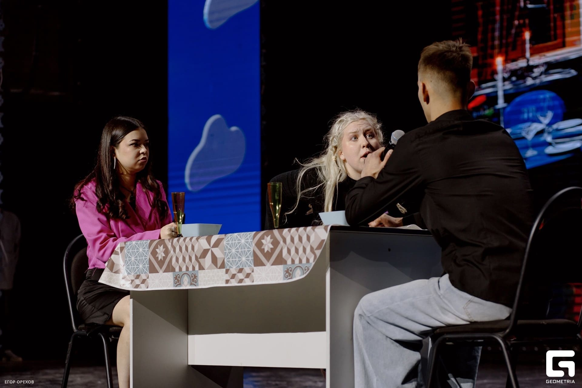 Свой вайб у команды. На сцене две "чики" и Кирилл со своим очень даже забавным миром. Начинают и вовсе молча, а потом окунают зрителей в тот самый мир абсурда и смешной дурацкости. Смешной психолог, который следит за своим пациентом. И не менее забавное знакомство девушки с отцом парня. Отец - тот же Кирилл со своими "завихрениями". Зал не сразу, но постепенно проникается происходящим на сцене. В конце признание от Кирилла девочкам: "Давно хотел вам сказать. У меня есть другие. Шутки...")) Желаем вам приучить зрителя к своему юмору и всё получится! Классно осознавать, что альтернативные реальности существуют и бывают очень даже смешными! Удачи в сезоне!